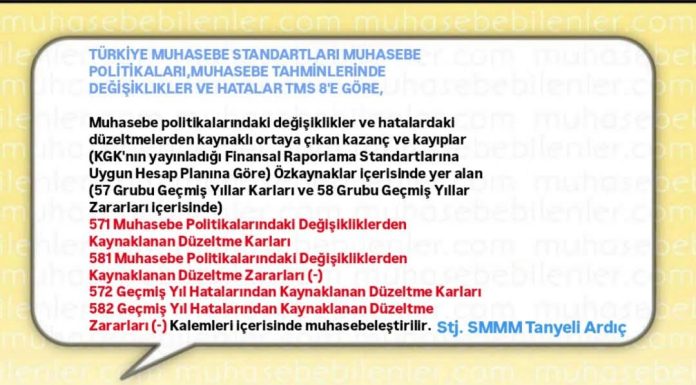 TÜRKİYE MUHASEBE STANDARTLARI MUHASEBE POLİTİKALARI,MUHASEBE TAHMİNLERİNDE DEĞİŞİKLIKLER VE HATALAR TMS 8'E GÖRE,Muhasebe politikalarındaki değişiklikler ve hatalardaki düzeltmelerden kaynaklı ortaya çıkan kazanç ve kayıplar (KGK'nın yayınladığı Finansal Raporlama Standartlarına Uygun Hesap Planına Göre) Özkaynaklar içerisinde yer alan (57 Grubu Geçmiş Yıllar Karları ve 58 Grubu Geçmiş Yıllar Zararları içerisinde)