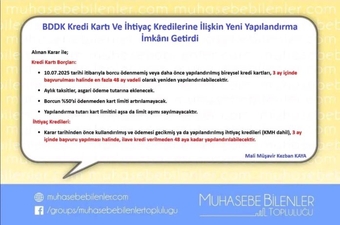 * 10.07.2025 tarihi itibarıyla borcu ödenmemiş veya daha önce yapılandırılmış bireysel kredi kartları, *3 ay içinde başvurulması halinde* en fazla *48 ay vadeli* olarak yeniden yapılandırılabilecektir.