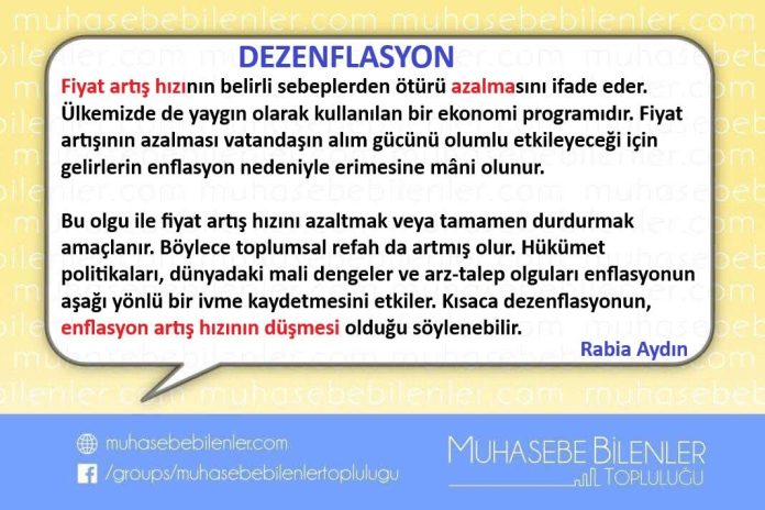 Fiyat artış hızının belirli sebeplerden ötürü azalmasını ifade eder. Ülkemizde de yaygın olarak kullanılan bir ekonomi programıdır. Fiyat artışının azalması vatandaşın alım gücünü olumlu etkileyeceği için gelirlerin enflasyon nedeniyle erimesine mâni olunur.