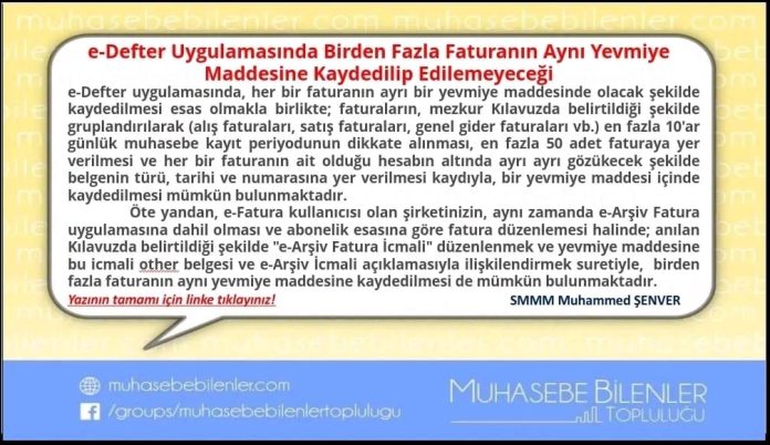 Bununla birlikte, muhasebe kaydına konu edilecek faturaların aynı mahiyette olacak şekilde gruplandırılması (Örneğin Mal ve Hizmet Satış Faturaları, Mal ve Hizmet Alış Faturaları, Genel Gider Faturaları, vb şekilde gruplandırılması) en fazla 10’ar günlük muhasebe kayıt periyodunun dikkate alınması, en fazla 50 adet faturaya yer verilmesi ve her bir faturanın ait olduğu hesabın altında ayrı ayrı gözükecek şekilde belgenin türü, tarihi ve numarasına yer verilmesi kaydıyla, bir yevmiye maddesi içinde kaydedilmesi mümkün bulunmaktadır.” açıklamasına yer verilmiştir.