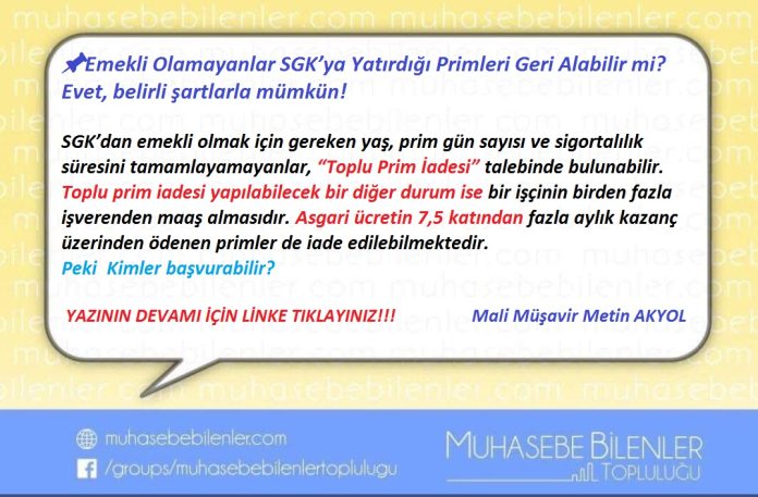 SGK’dan emekli olmak için gereken yaş, prim gün sayısı ve sigortalılık süresini tamamlayamayanlar, *“Toplu Prim İadesi”* talebinde bulunabilir.