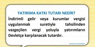 YATIRIMA KATKI TUTARI NEDİR?İndirimli gelir veya kurumlar vergisi uygulanmak suretiyle tahsilinden vazgeçilen vergi yoluyla yatırımların Devletçe karşılanacak tutardır.S.M.M.M.FETULLAH MAYDA