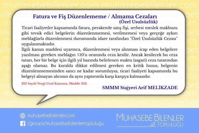 Ticari faaliyetler kapsamında fatura, perakende satış fişi, serbest meslek makbuzu gibi tevsik edici belgelerin düzenlenmemesi, verilmemesi veya gerçeğe aykırı meblağlarla düzenlenmesi durumunda idare tarafından “Özel Usulsüzlük Cezası” uygulanmaktadır.