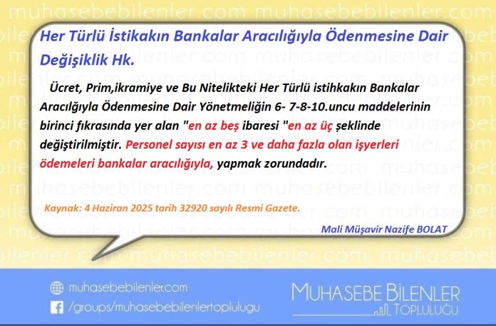 Ücret, Prim,ikramiye ve Bu Nitelikteki Her Türlü istihkakın Bankalar Aracılığıyla Ödenmesine Dair Yönetmeliğin 6- 7-8-10.uncu maddelerinin birinci fıkrasında yer alan “en az beș ibaresi “en az üç șeklinde değiştirilmiştir. Personel sayısı en az 3 ve daha fazla olan işyerleri ödemeleri bankalar aracılığıyla, yapmak zorundadır.