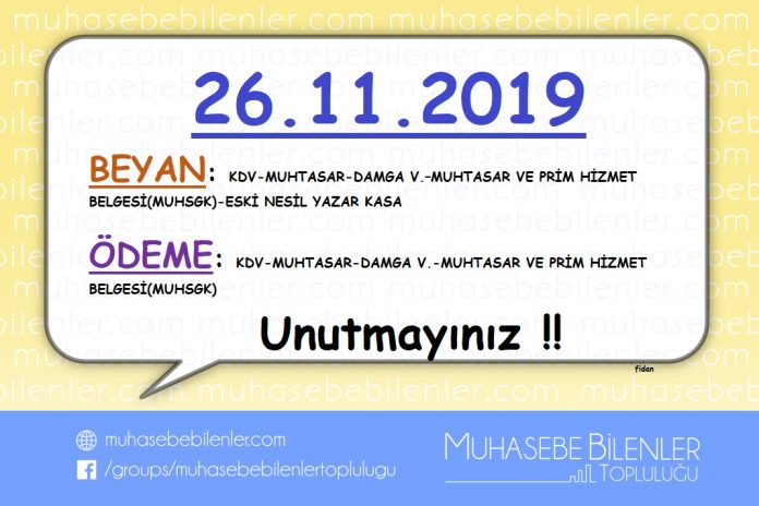 KASİM SON GUN HATİRLATMALARİ 3Yazar M.B.T. Site Moderatörü Mali Müşavir Fidan Aslantaş - 21 Kasım 2019 Facebook'ta Paylaş Twitter'da Paylaş tweet Bİ REKLAM ARASI :) 26.11.2019 BEYAN: KDV-MUHTASAR-DAMGA V.–MUHTASAR VE PRİM HİZMET BELGESİ(MUHSGK)-ESKİ NESİL YAZAR KASAÖDEME: KDV-MUHTASAR-DAMGA V.-MUHTASAR VE PRİM HİZMET BELGESİ(MUHSGK) Unutmayınız !! Saygılarımla, S.M.Mali MüşavirFidan ASLANTAŞBİ REKLAM ARASI :)