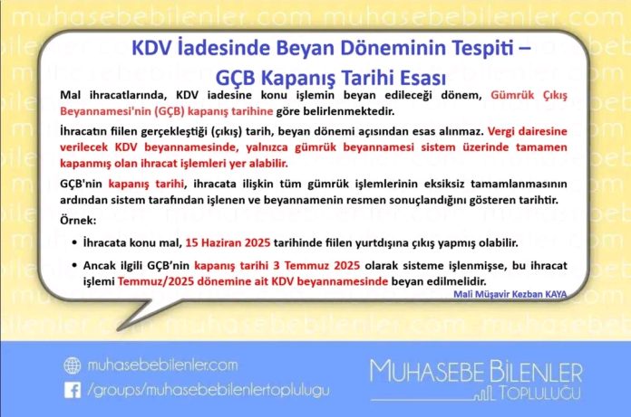 **Mal ihracatlarında, KDV iadesine konu işlemin beyan edileceği dönem, Gümrük Çıkış Beyannamesi’nin (GÇB) kapanış tarihine göre belirlenmektedir.**