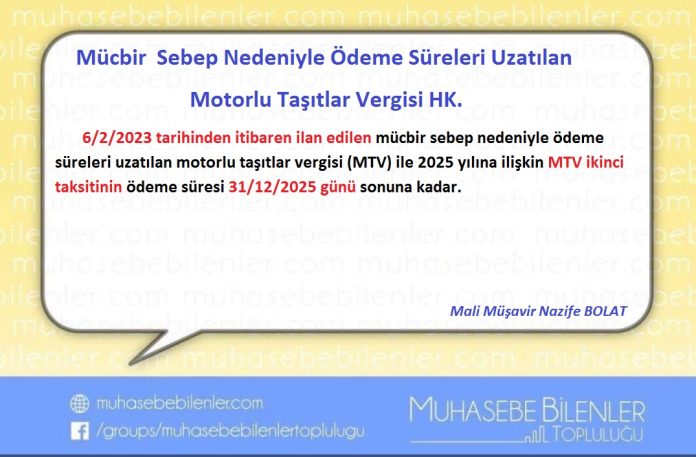 6/2/2023 tarihinden itibaren ilan edilen mücbir sebep nedeniyle ödeme süreleri uzatılan motorlu taşıtlar vergisi (MTV) ile 2025 yılına ilişkin MTV ikinci taksitinin ödeme süresi 31/12/2025 günü sonuna kadar.