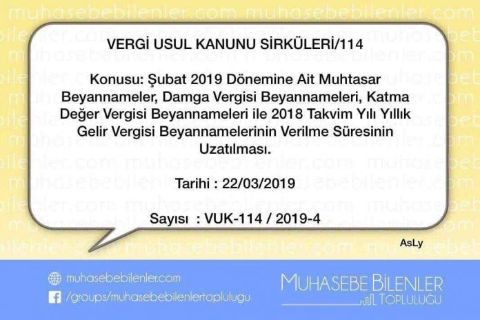 Bakanlığımıza iletilen talepler doğrultusunda, Vergi Usul Kanununun mükerrer 28 inci maddesindeki yetkiye dayanılarak; Şubat 2019 dönemine Ait Muhtasar Beyannameler, Damga Vergisi Beyannameleri, Katma Değer Vergisi Beyannameleri ile 2018 takvim yılı Yıllık Gelir Vergisi Beyannamelerinin verilme süresinin uzatılması bu sirkülerin konusunu oluşturmaktadır.