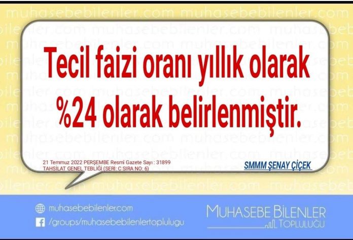 6183 sayılı Amme Alacaklarının Tahsil Usulü Hakkında Kanunun 48 inci maddesi ile Bakanlığımıza tanınan yetkiye istinaden, halen yıllık %15 olarak uygulanmakta olan tecil faizi oranı bu Tebliğin yayımı tarihinden itibaren yıllık %24 olarak belirlenmiştir.